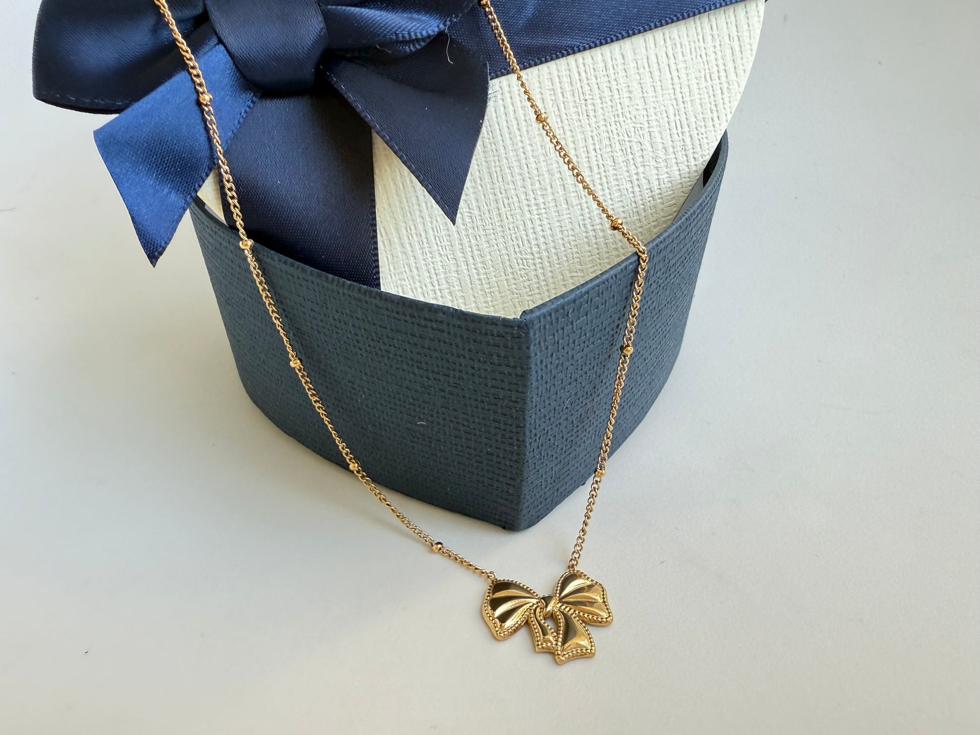 Este colgante lazo dorado combina elegancia y simbolismo en un diseño delicado y sofisticado. Su acabado en dorado aporta un brillo sutil que realza cualquier conjunto, mientras que la forma de lazo representa unión y cariño. Perfecto para quienes buscan una pieza versátil que aporte un toque de distinción y significado a su estilo diario.